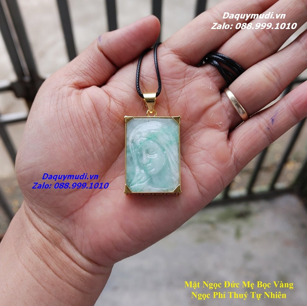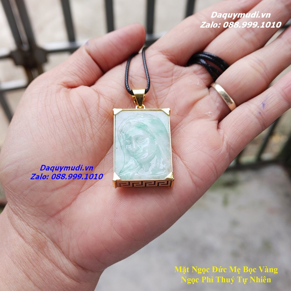 Bộ sản phẩm gồm: Mặt dây chuyền chạm khắc hình Đức Mẹ Maria từ chất liệu ngọc Phỉ Thuý tự nhiên bọc vàng 10k khắc chữ Vạn – Ngọc Jadeite Myanmar tự nhiên, dây đeo, túi nhung đỏ, hộp đựng.