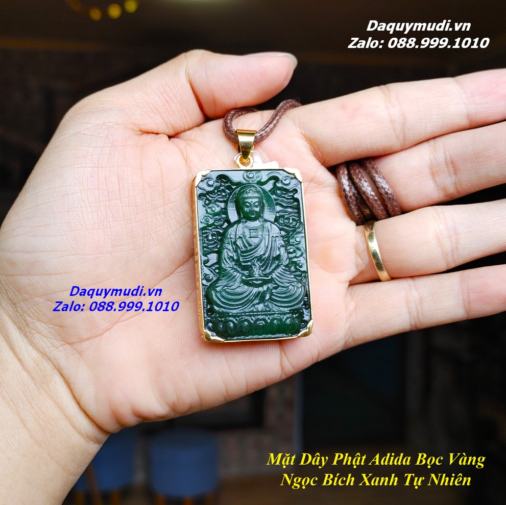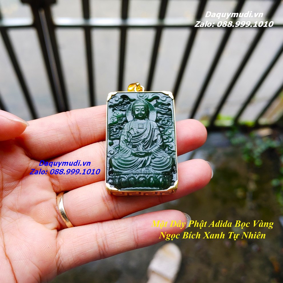 Bộ sản phẩm gồm: 1 mặt dây chuyền chạm khắc Phật ADIDA từ chất liệu NGỌC BÍCH XANH tự nhiên có bọc VÀNG 10K như hình ảnh, dây đeo, túi nhung đỏ, hộp đựng sang trọng.
