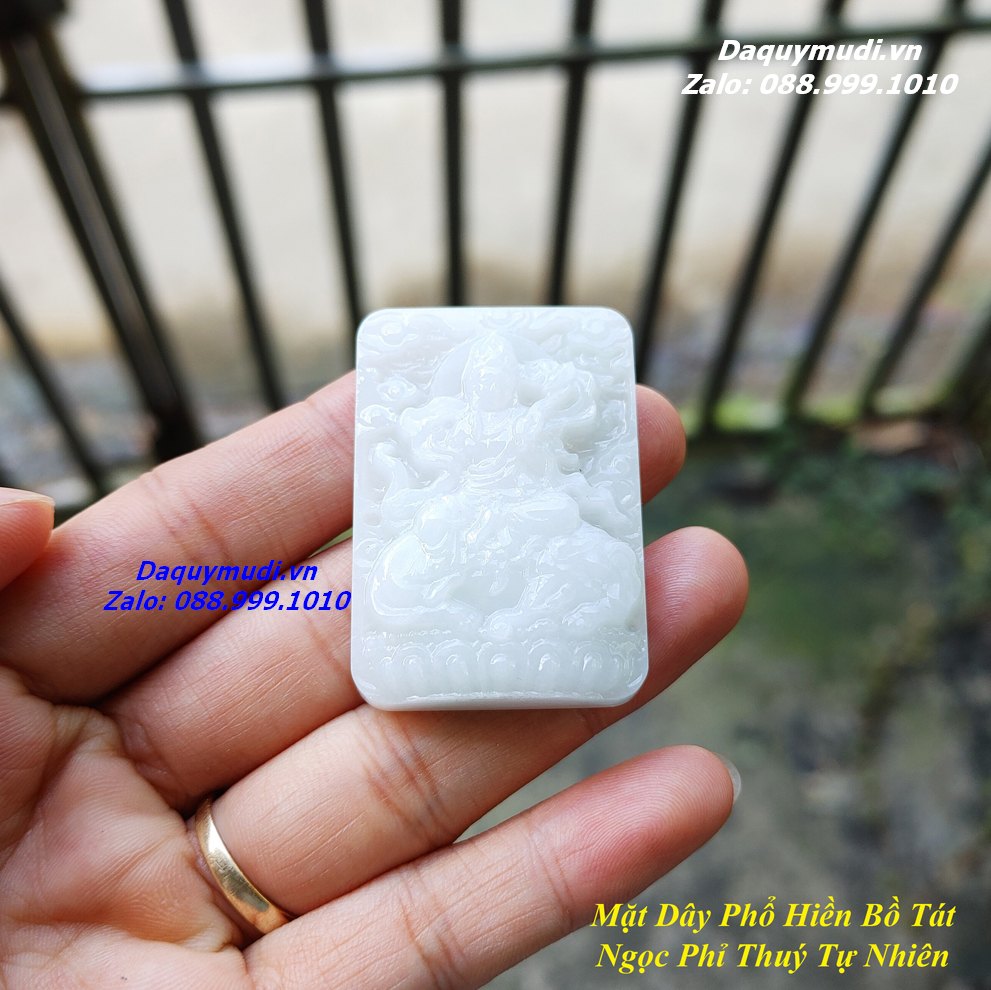 Bộ sản phẩm gồm: Mặt dây chuyền ngọc chạm khắc PHỔ HIỀN BỒ TÁT từ chất liệu ngọc Phỉ Thuý màu Trắng – Ngọc Jadeite Myanmar tự nhiên, dây đeo, túi nhung đỏ, hộp đựng.