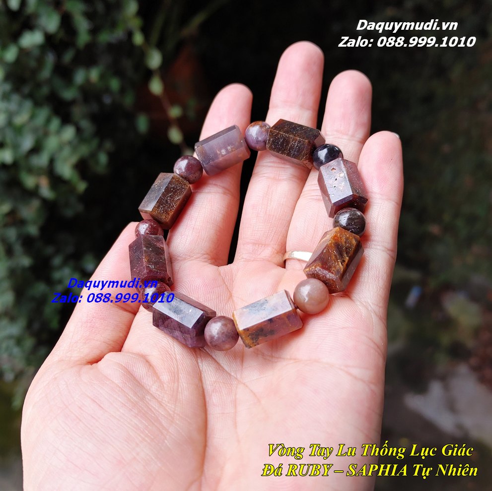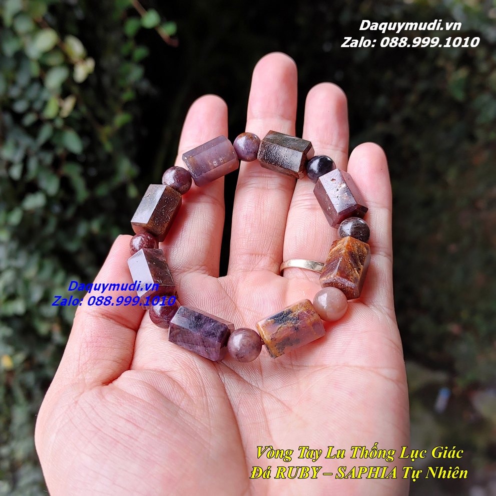 Bộ sản phẩm gồm: Vòng tay đá RUBY tự nhiên dáng lu thống lục giác mài thủ công như hình ảnh – dây xâu dự phòng, túi nhung đỏ, hộp đựng.